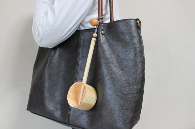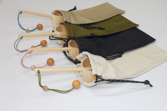 持ち運びやすいように、チイの木珠付き根付ストラップ、大和紡績(株)のVENTILE®製巾着袋も付属しているんです。