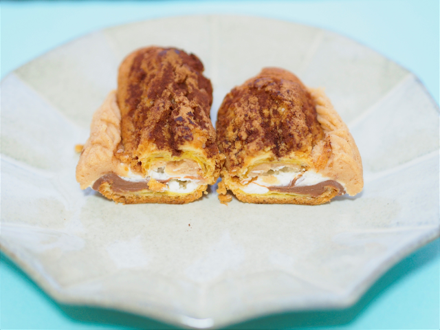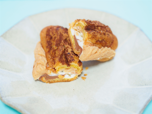 エクレア生地は、空気をよく含んでいるため歯切れの良い食べ心地。パサパサしている部分もなく、ほどよい塩気があるのでサンドされているクリームとも相性バツグンだ。