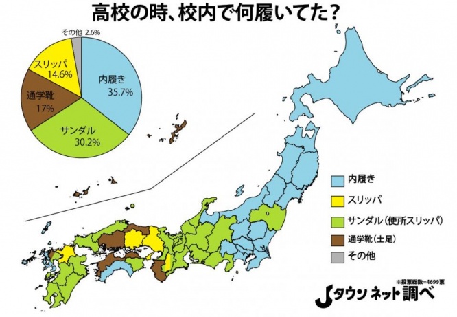 東西でここまで違うとは... 日本全国「高校の時、校内で何履いてた?」マップがこちら (1/3ページ)