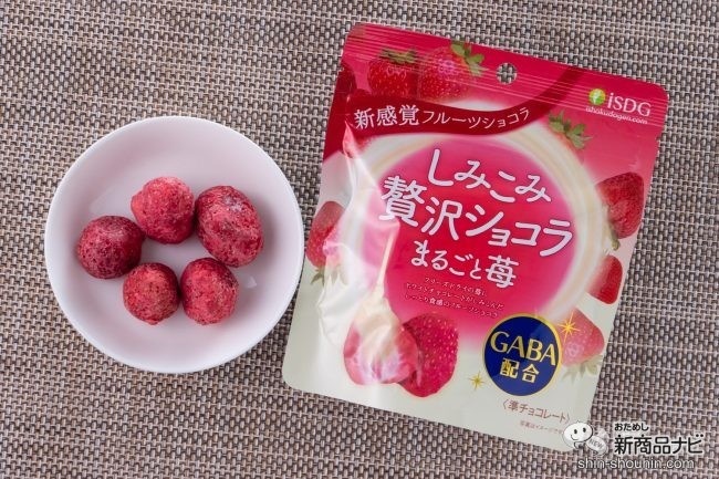 今回紹介する『しみこみ贅沢ショコラ』(全2種・希望小売価格 税抜298円・2020年11月20日新発売)は、フリーズドライ加工したフルーツにチョコレートを染み込ませた準チョコレート。今、話題のリラックス成分「GABA」を配合しており、おいしさ以外にも嬉しいポイントが!