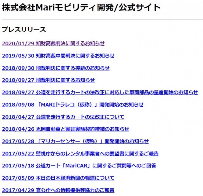 一方、株式会社Mariモビリティ開発のウェブサイトを見ると最後の更新が2020年1月29日で止まっているほか、過去にあったカードレンタルのサービス情報が全てなくなっている。ページの下の方にスクロールしていくと「株式会社Mariモビリティ開発は、任天堂株式会社、ゲーム『マリオカート』とは無関係です。『マリカー』は株式会社Mariモビリティ開発の登録商標です」と書かれている。