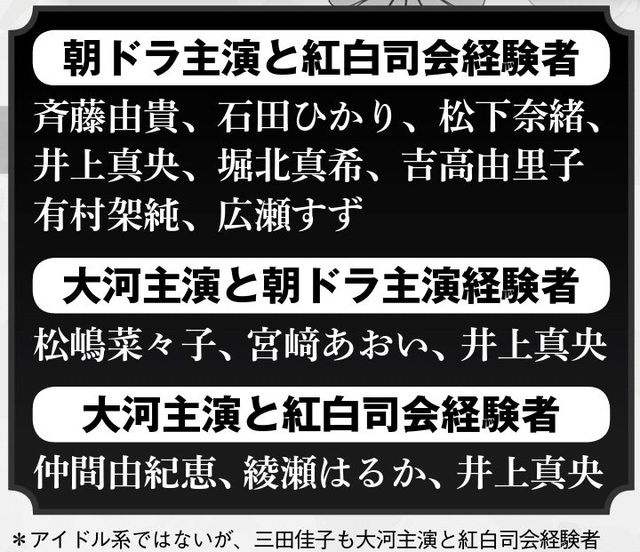 とはいえ、2大ドラマの両方に主演したアイドル系女優は『ひまわり』と『利家とまつ』の松嶋菜々子、『純情きらり』と『篤姫』の宮㟢あおい、『おひさま』『花燃ゆ』の井上真央と3名だけ。