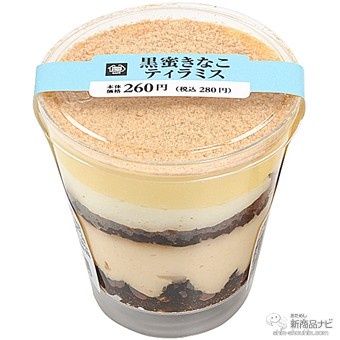 黒蜜ゼリーにきなこティラミスムースを重ね、コーヒーシロップを染み込ませたスポンジにホイップクリームとティラミスムースをしぼった一品。