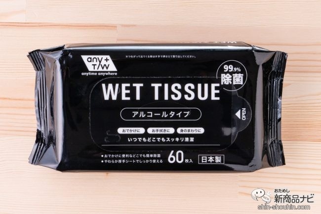 続いては昭和紙工(香川県観音寺市)『99.9%除菌お手拭きウェットティッシュ』(60枚入・140×190mm・実勢価格 税込217円・発売中)。精悍なブラックパッケージの、アルコールタイプのウェットティッシュだ。