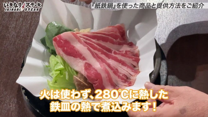 「紙鉄鍋」とはそのままで紙で作られた鍋だ。『いきなり!ステーキ』の「紙鉄鍋」はステーキを焼く鉄板の熱を使いすき焼きを行うというもの。