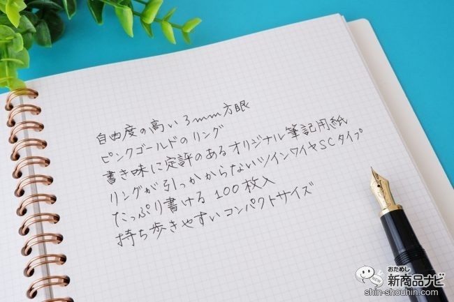 パタッとしっかりと開けるリング仕様で書きやすそう。ピンクゴールドのリングは上品で高級感がある。