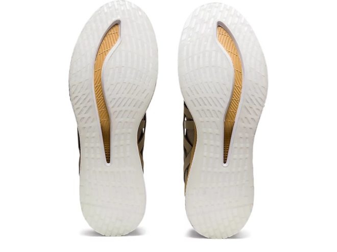 新色でも引き継がれたニット素材を用いたモノソック構造のアッパーを覆うデザインは、日本の伝統的な竹編み技法「やたら編み」をモチーフにしたもので、編み込みをよく見てみると、アシックスストライプがしっかりデザインされているのに気づきます。