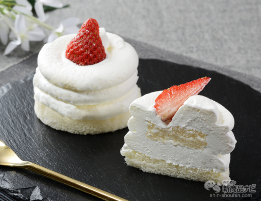 牛乳や練乳を合わせた口どけなめらかなブレンドクリームと、白くふわふわした食感のスポンジを重ねたケーキ。ハーフサイズにカットした苺をトッピング。クリームを楽しむ一品。