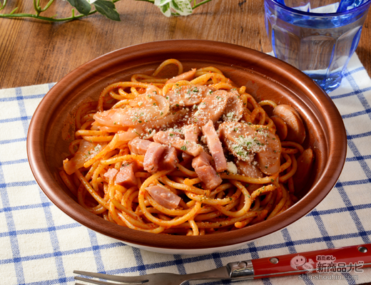 ウインナーとベーコンのダブルメインのナポリタン。トマトケチャップのほのかな酸味と甘みがやみつき感のある絶妙なバランスに。もっちり感のある2.1mmのパスタで食べごたえのある仕立て。ウインナー・ベーコン・玉ねぎ・粉チーズ・パセリを彩りよくトッピング。