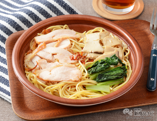 しっとりとした食感のローストチキンをメインに、食感のよいエリンギを合わせた和風パスタ。香ばしいだし醤油に昆布茶でうまみをきかせた一品。ローストチキン・エリンギ・小松菜・唐辛子を彩りよくトッピング。