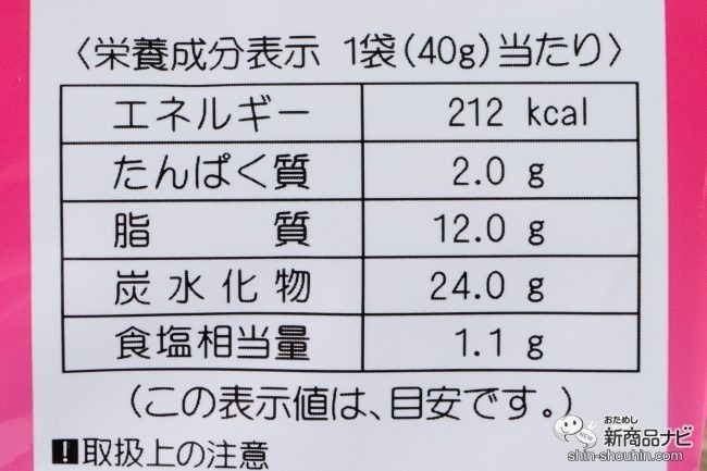 やや小ぶりの手に取りやすい大きさで、1袋212kcal。おやつにもおつまみにもちょうど良い。
