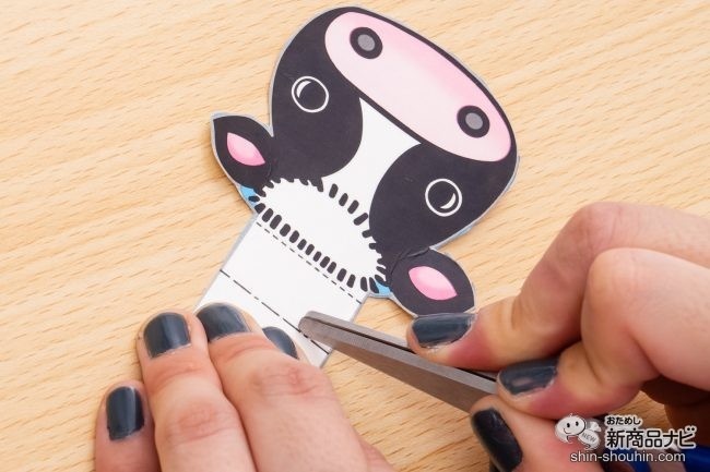 この部分はVの字に切るようだ。牛乳パックの下部は牛の柄っぽいデザインになっていて、ここが牛のからだになるようだ。