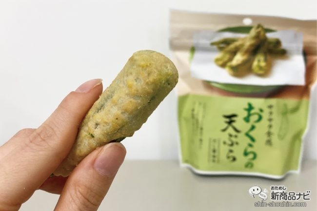 まずはおくらのイメージに合ったグリーンカラーの『おくらの天ぷら』(45g・希望小売価格 税込378円・発売中)からためしてみよう。パッケージにチャックがついており、鮮度をキープできるのは高ポイントだ。
