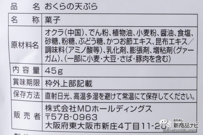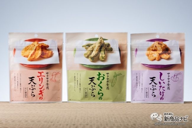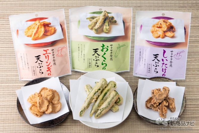 MDホールディングスの天ぷらシリーズは、バキュームフライ製法で揚げた素材をだし醤油味に仕上げた、見た目もそのまま“天ぷら”なスナック。今回は新発売の『おくらの天ぷら』を、『しいたけの天ぷら』『エリンギの天ぷら』と一緒におためし!