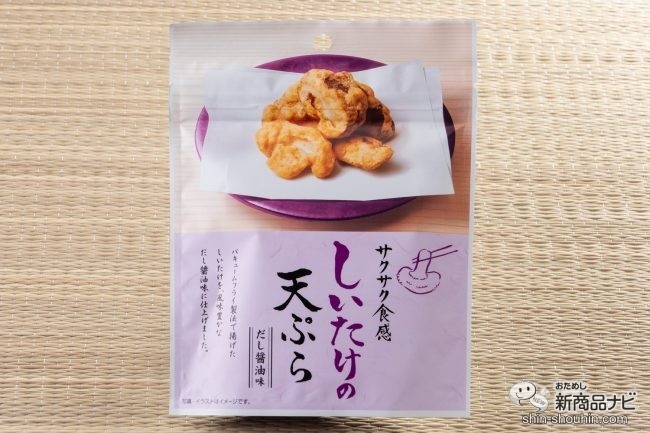 続いて試すのは、紫色パッケージが渋めの『しいたけの天ぷら』(42g・希望小売価格 税込378円・発売中)。記者はしいたけの天ぷらが大好きなので、食べる前からテンションが上がる!