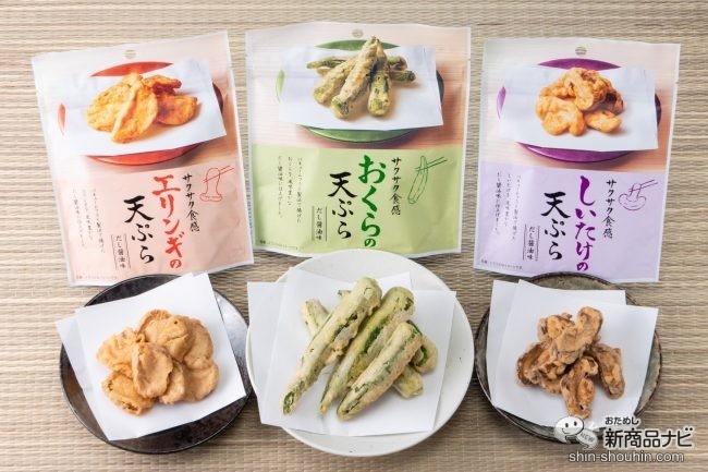 3種類からなる天ぷらシリーズは、それぞれしいたけ、エリンギ、おくらをバキュームフライ製法で揚げ、風味豊かなだし醤油で仕上げているのが特徴。形がそのまま残るように作られているため、見た目のインパクトもバッチリ! 見た目から天ぷらそのもので新しい。
