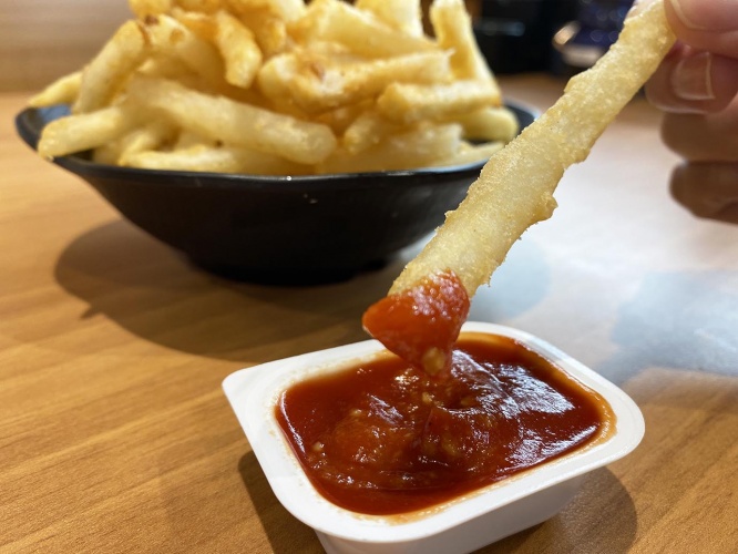 フライドポテトはプレーンなままでも定番の美味しさを堪能できるが、ケチャップをつけても美味。しかしさらなる美味しさを求めるならば、ケチャップに「くら寿司」特製のワサビを混ぜ「ワサップ」を作り、それにフライドポテトをつけて食べると一味違ったフライドポテトが楽しめる。