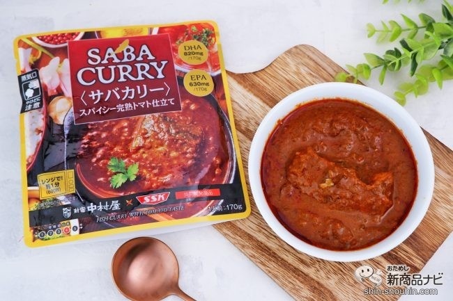 赤いレトルトパウチは『サバカリー スパイシー完熟トマト仕立て』(170g・希望小売価格 324円)。こちらもあめ色になるまでじっくり炒めた玉ねぎの甘みがベース。完熟トマトの豊かな酸味と新宿中村屋オリジナルスパイスの芳醇な香りで、スパイシーで爽やかなインドカリーとなっている。