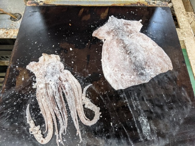 こちらは『いかぺったん』の製造現場。丸ごと豪快に挟み焼き!秘伝のタレに漬け込んだいかは、澱粉で薄く衣をつけられ、鉄板で挟み焼きに。