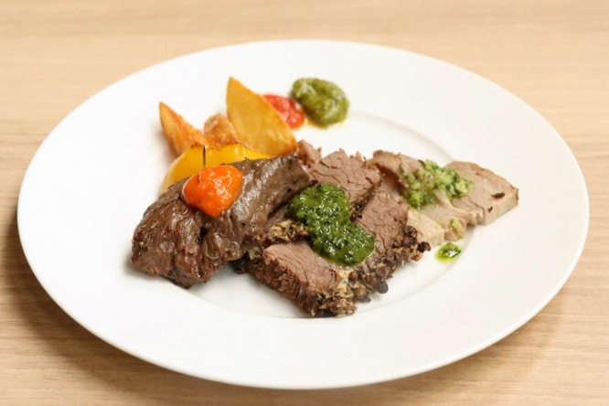 ビーフバーベキューの力強い味わいの赤身にはパプリカとナッツを使ったコクのあるロメスコソース、デュロック豚のローストにはアーモンドやハーブ、ガーリックなどをすりつぶして作るピカーダソースというように、それぞれのお肉の味わいを引き立てるソースが秀逸です。