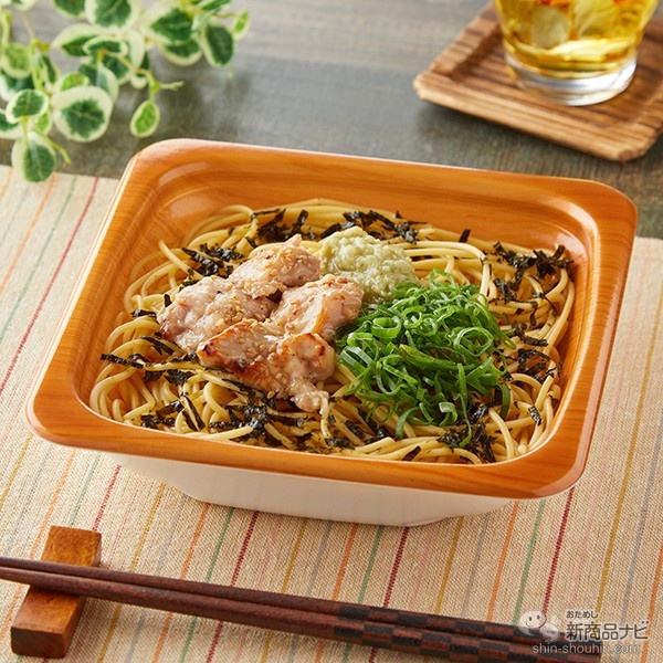 だしつゆや醤油で和えたパスタの上に、塩ダレやかつおだしで和えた鶏肉と青ねぎ、わさびをトッピング。わさびのツンとくる刺激が、和風のパスタと鶏肉とよく合う一品。