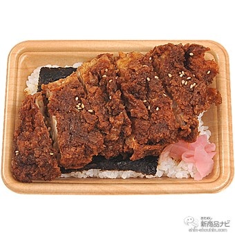 海苔・おかかをトッピングしたご飯に、たっぷりとソースを染み込ませた大ぶりなチキンカツをのせたボリュームのある弁当。