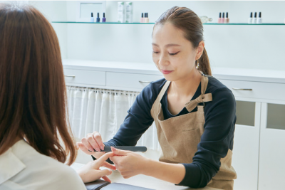 指先のケアの技能も有したしたネイリストが、ささくれや余計な角質を取り除くことで手先を清潔にキレイにし、優しく包み込むように手元全体の保湿を行う。