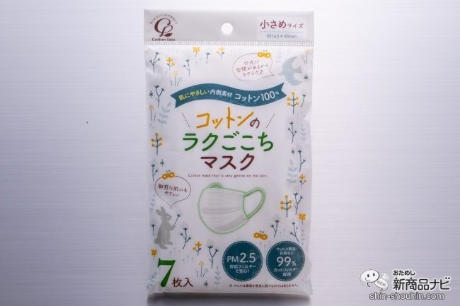 大人用は『コットンのラクごこちマスク 小さめサイズ』(7枚入り・サイズ 約145×95㎜・価格 税込327円/編集部調べ・発売中)。口元に空間を作るセンターワイヤーを採用し、こちらも楽な付け心地にこだわっている。
