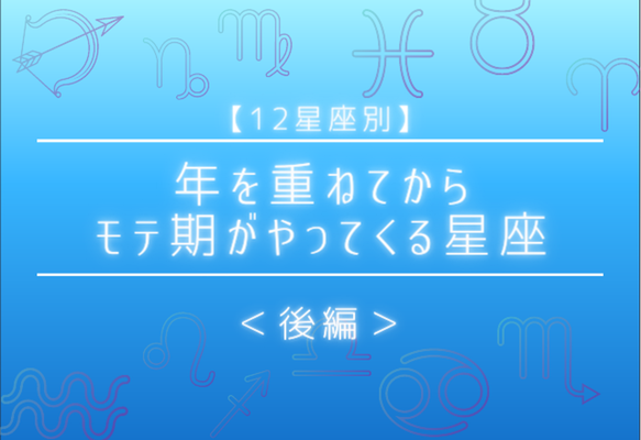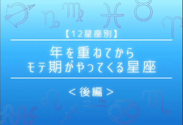 ここでは「モテ期が遅れてやって来る星座」をご紹介しました。若い時にモテなくても、きっとあなたの魅力は歳とともに増していくでしょう。