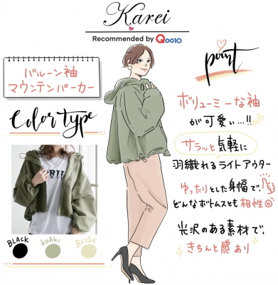人気のコーナー、Qoo10 コーデ『今日のりおポチ』では、内田理央さんのこの秋のおススメファッションアイテムとしてKAREI(カレイ)のバルーン袖マウンテンパーカーが紹介されました。