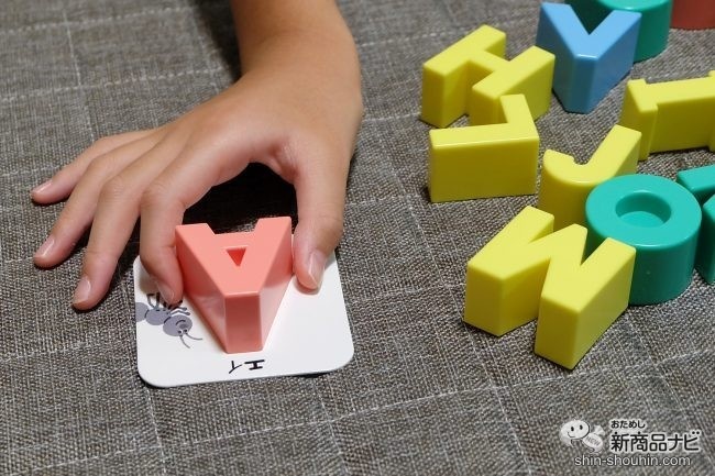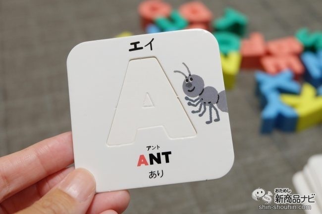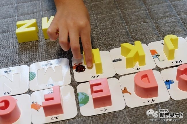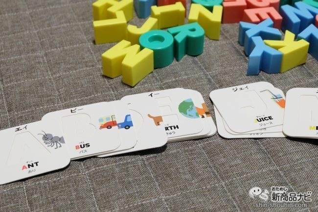 かるた二つ目は「かるた」に挑戦。ブロックを子どもが並べ、大文字カードを大人が準備。大文字カードをじっくり見てみると、より英語に興味を深める秘密が!