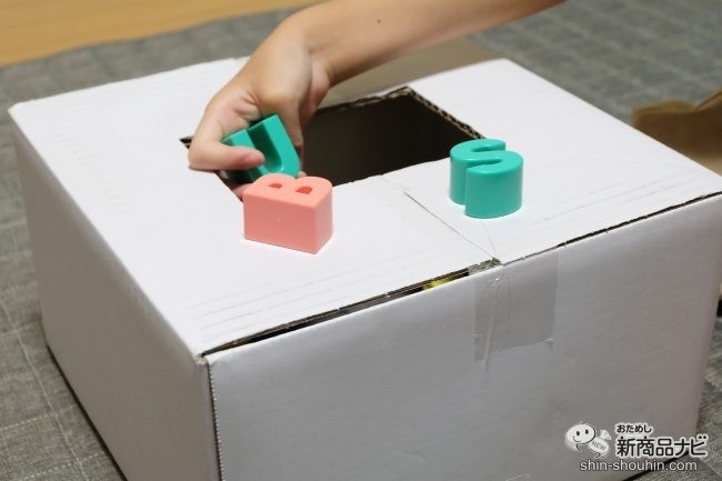 しばらく楽しんでいたら、娘が白い箱を持ってきて、新たな遊びを考えはじめたので少し紹介したい。ブロックに箱をかぶせて、