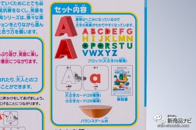 「アルファベットに親しむ」「英語への興味を広げる」をねらいとして設計されている『たっぷり7つの遊び! ABCブロック』。箱の中にはブロックと大文字カード、小文字カード、バランスゲーム台、解説書が入っている。