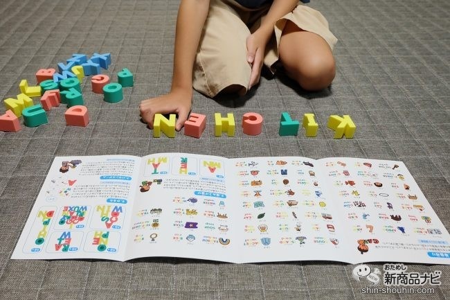 単語作り一つ目は「単語作り」に挑戦。解説書にある56個の単語の中から好きなものを選び、その単語をブロックで作ってみよう。解説書には、単語の意味、大文字、小文字、発音、イラストが記載されている。アルファベットの色もヒントにしながら、パズルに近い感覚で単語作りを楽しむことができる。