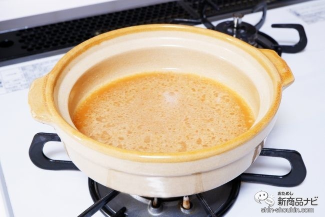 『ラーメン有名店コラボ鍋つゆ にんにく豚骨醤油』のできあがり! とにかくにんにくの香りがガツンとくる。食べる時間帯は少し意識しないといけないかもしれないが、この本気の香りだけで、おいしさを確信してしまう。