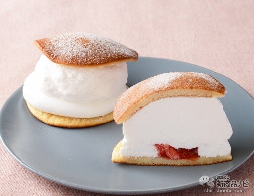 「どら焼き×ショートケーキ」の未知なるおいしさ!薄皮生地とクリームのコラボ!どら焼きの薄皮生地に北海道産生クリームを配合したホイップクリームをたっぷりとサンド。アクセントに甘酸っぱい果肉入り苺ソースを合わせた一品。