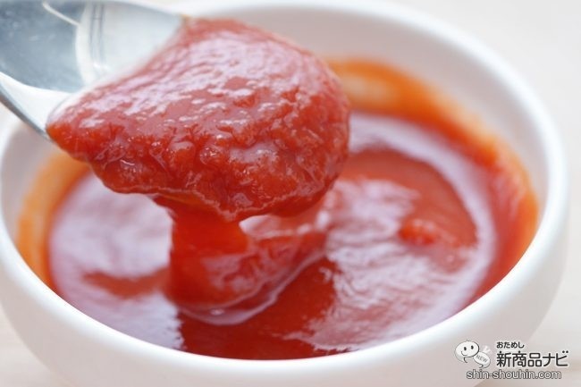 このトマトの質感!ジュレみたい!また、うらごしのトマトの質感を活かすため、通常のケチャップとは異なるフレッシュ感をキープする製法で作られている。さらに、芳酵でフルーティーな味わいが特長のパイナップルビネガーを増量し、おいしさ増し増しなのだとか!