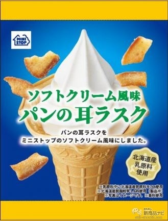 ミニストップのソフトクリームに使用されている「北海道産乳原料」を使った、濃厚なミルク感を味わえるソフトクリーム風味に仕上げた「パンの耳ラスク」。食パンの耳をこんがり焼き上げ、サクサク食感が楽しめる。