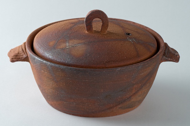 素地は土鍋に泥状にした野幌粘土を刷毛塗り。土鍋側面は、焼成時に藁を巻くことで、土と藁の成分同士が化学反応を起こし、緋色の線が現れています。