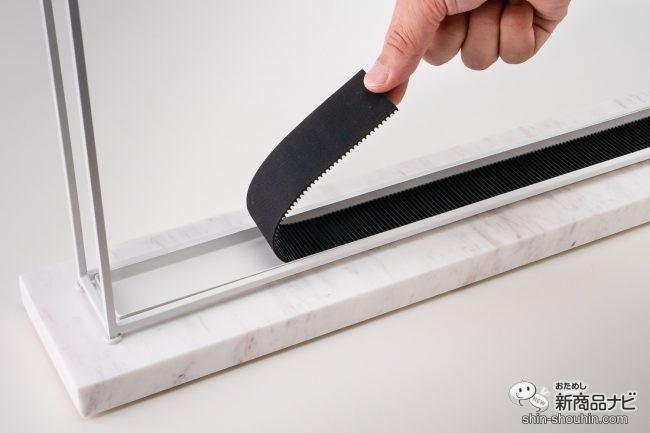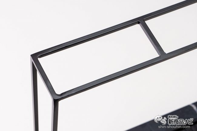 スチールフレームは想像以上に細く繊細なフォルム。大理石ベースとは対照的ともいえる軽やかなシルエットの線だ。ひんやりなめらかな手触りも心地よい。