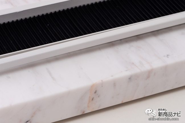 土台の大理石は本格的な天然物。樹脂製の人工大理石とは違い、ずっしりとした重厚感が頼もしい。ほんのりオレンジがかった色合いもマーブル模様の濃淡も、ひとつとして同じものはなく、唯一無二の美しさはそれだけで価値があるだろう。真っ白じゃないから、玄関に多いモルタルやタイルなどの材質と寄り添っても、すっと互いを受け入れて浮かない。