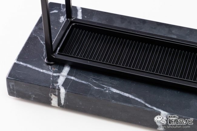 土台の大理石は重さがあり倒れにくく、取り外し可能な水受けトレーと滑り止めシート付き。植物やオーナメントを添えてデコレーションしても良し、タオルをかけても良しと、傘立ての枠を超えた自分だけの使い方を楽しめる。