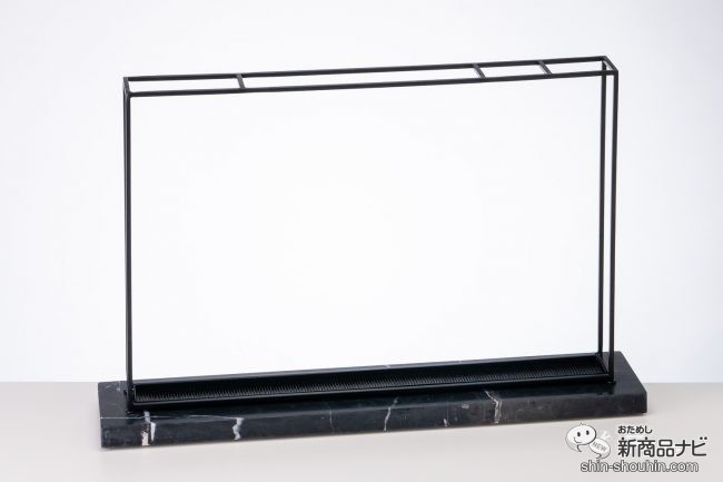 こんなにスリムなのに、たっぷり10本収納できる!特徴は、重厚感のある大理石ベースと細いスチールフレームの融合。照明と同様、背景の壁紙や景色を切り取るようなフレーム感がこだわりだ。