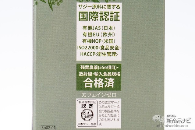 日本サジー協会の製品基準をクリアし、認証マークが記載されている。