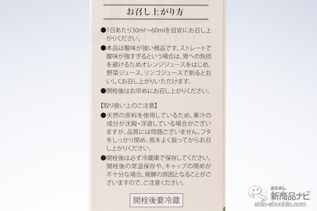 天然の原料を使用しているので果汁成分が沈殿、浮遊していることがあるため、瓶をよく振ってから取り出そう。