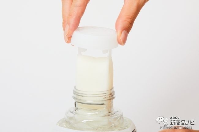 他の液体タイプの商品は、外側に巻くフィルムの有無は別として、容器が透明か半透明で中身が見えるタイプなので、吸水芯や中の液体が見える。しかしこれは、上部のキャップ越しにほんの少し見えるだけで、ほぼ見えない作りになっている。これにより、「生活感」のような雰囲気がかなり抑えられている印象を受けた。