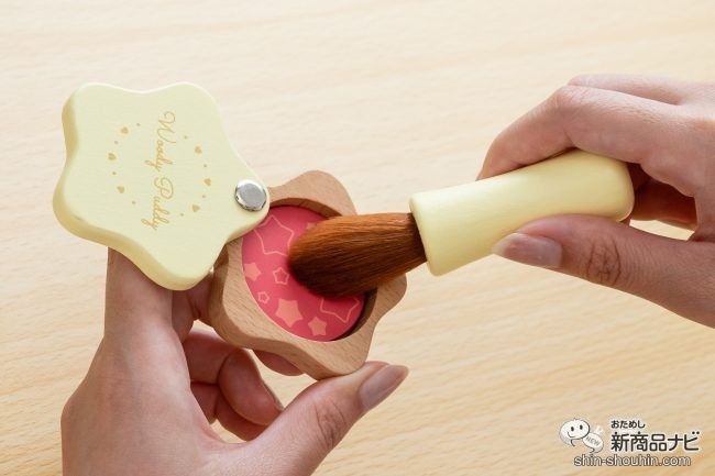 フタをくるりとスライドさせると中には星模様のピンクチーク。ブラシは本物のチークブラシと比べてもなんら遜色なく、子どもの肌に当てても全くチクチクしないほど柔らかくきめ細かい。