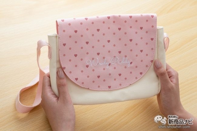 こちらはポシェット。ピンクのハートにラブリーさが溢れ出ている。30代だが相変わらずかわいいもの好きの記者は、周りの目が気にならなくなったらこんなバッグを持ちたいと思った。ふたの留め具はマグネット式なので小さな子どもでも開閉が簡単だ。