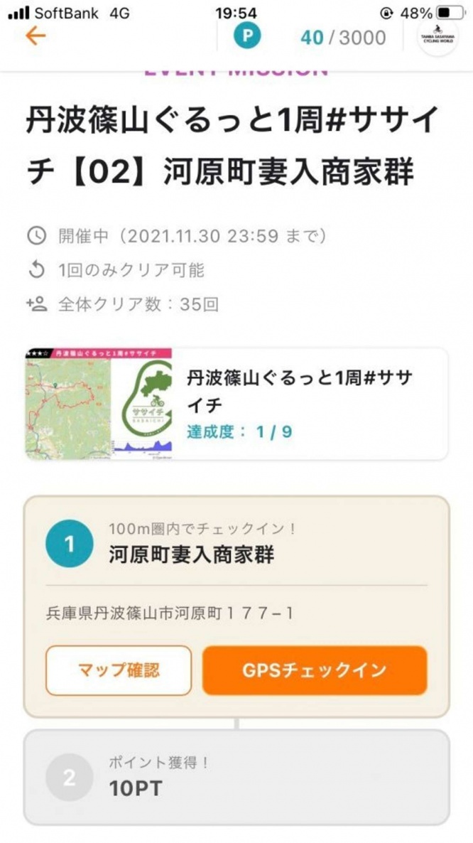 スマホのGPS機能をオンにしておき、目的地(ここでは「河原町妻入商家群」)に着いたらアプリ画面の「GPSチェックイン」をタップ。プレイヤーが目的地の100メートル圏内にいれば、ミッションクリア! ポイントを獲得できる。