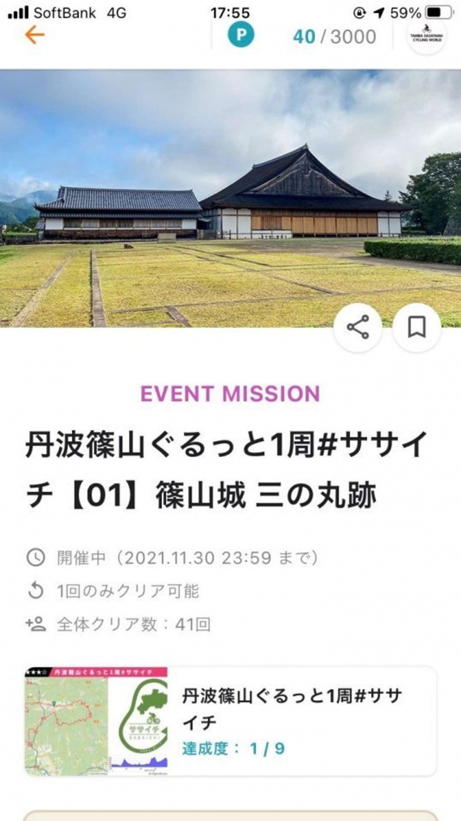 丹波篠山の様々なエリアを巡りながら、9つのミッションをクリアしていくコースだ。距離にして約105キロ。所要時間は6時間で、DIIIGのサイトには「何度かに分けてクリアしましょう」とある。